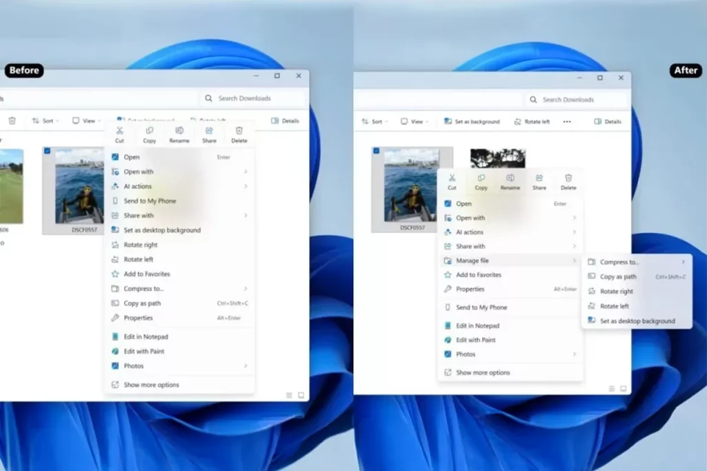 این بازطراحی باعث بهینه سازی منوی کلیک راست ویندوز 11 شده و اکنون زیرمنویی مخصوص مدیریت فایل وجود دارد که شامل گزینه هایی مثل فشرده سازی ZIP، کپی مسیر فایل، تنظیم تصویر برای پس زمینه دسکتاپ و ابزار چرخش تصویر است. این کار علاوه بر خلوت تر کردن منوی کلیک راست، دسترسی به گزینه های پرکاربرد را هم ساده تر کرده است.
